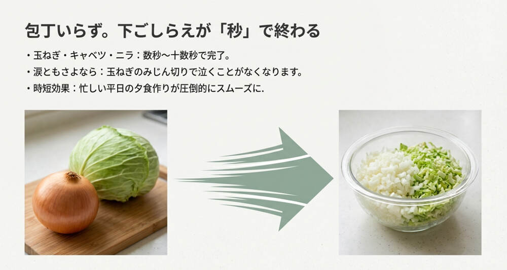 玉ねぎ、キャベツ、ニラなどが数秒でみじん切りになるため、調理時間が大幅に短縮されます。