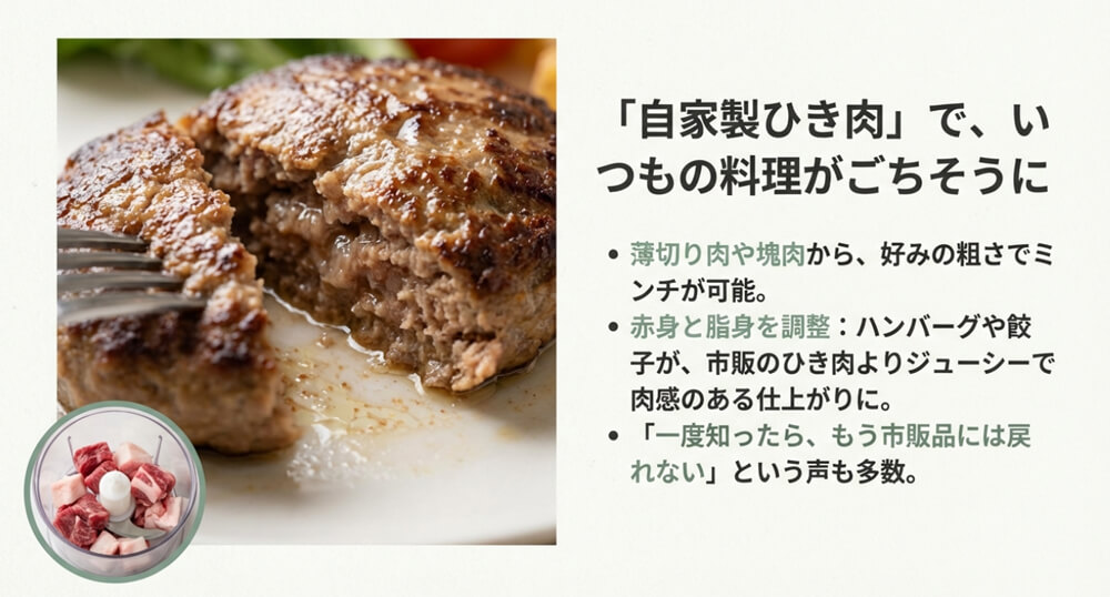 薄切り肉や塊肉から、自家製ひき肉が作れる点も高評価です。