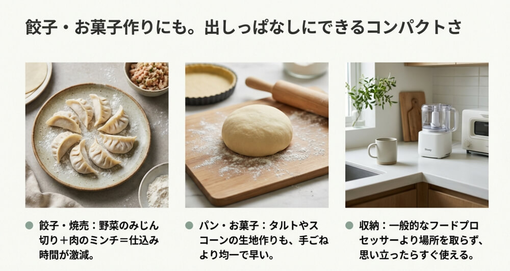 みじん切りやひき肉作り、餃子・パン・お菓子作りで高い評価がある一方、蓋の洗浄方法や価格面には注意が必要です。