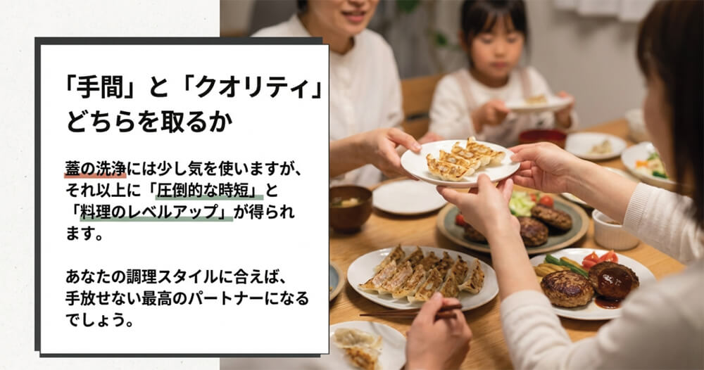 そのため、料理全体にかかる時間と労力が減り、毎日の料理がラクになります。